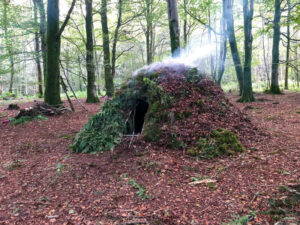 Natuurlijk Bushcraft Shelter gebruikt voor vijf dagen en nachten overleven in Schotland